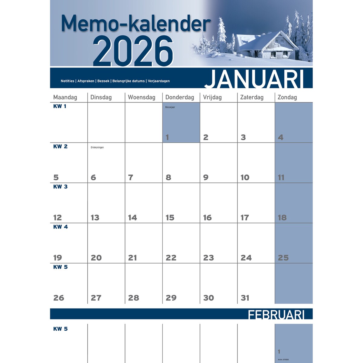 Ook in 2026 geen enkele afspraak of verjaardag vergeten? Bestel dan ook meteen deze memo-kalender mee! Met feestdagen en kalenderweken. 12 pagina’s van kwaliteitspapier.